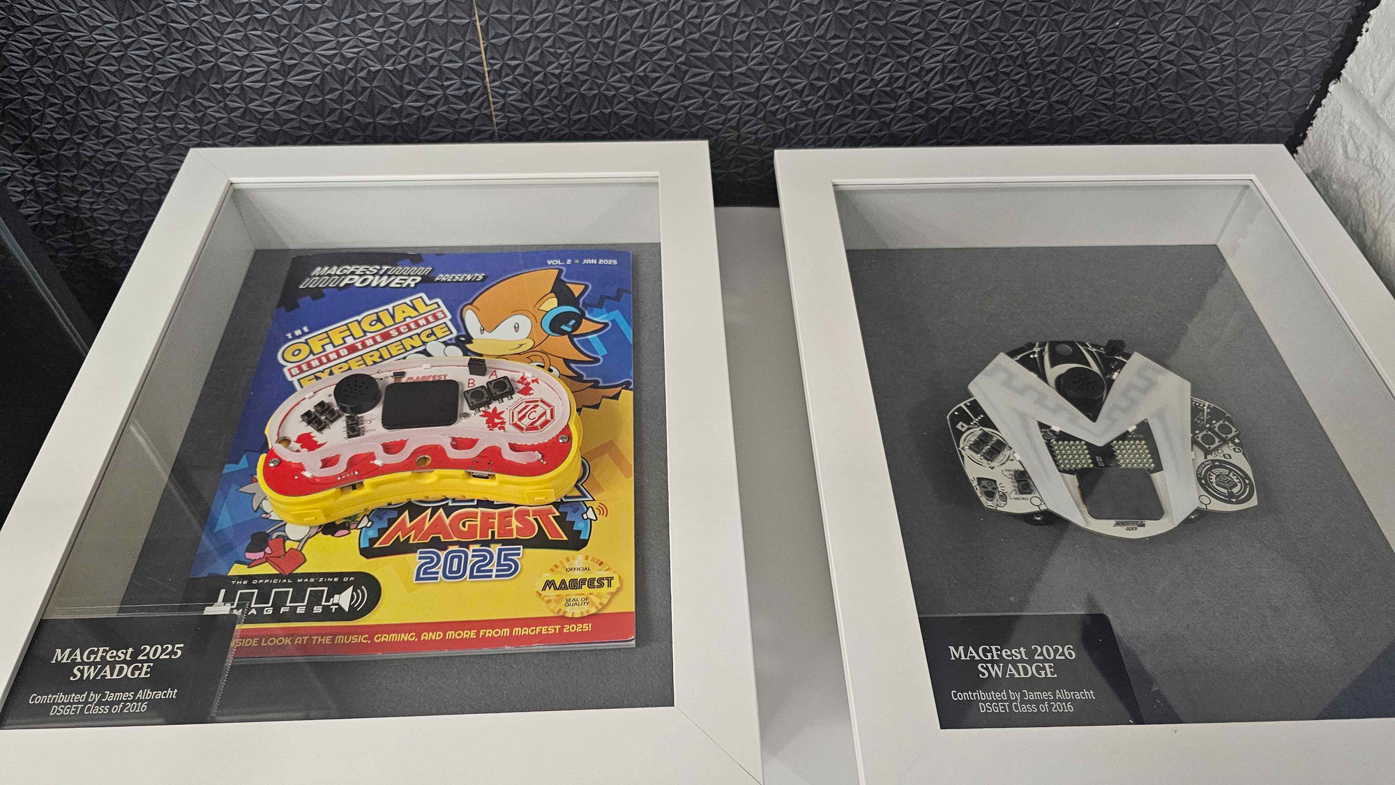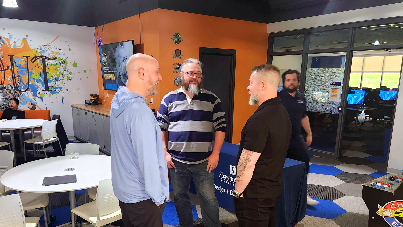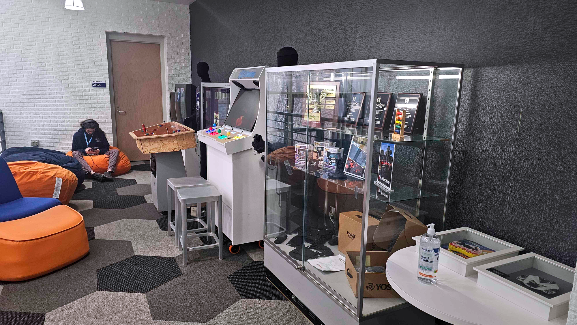 Layered throughout the space is a curated collection of awards and memorabilia, documenting the broader impact of the program. These artifacts include alumni game box art from shipped titles, a motion capture suit connected to early VR experimentation involving SSU Games graduates, a jersey designed by Marcus Cenci, and other items that reflect industry careers shaped through the program.