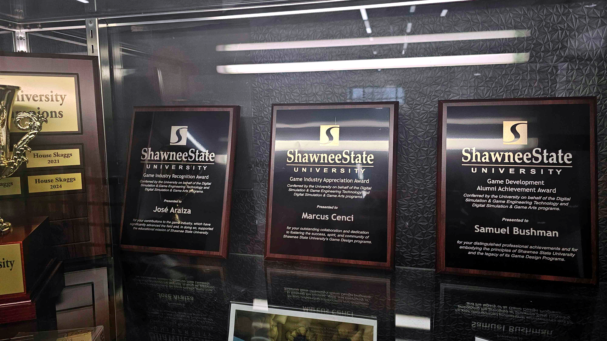 Across the Legacy & Culture Arcade, the SSU Games Impact Awards are showcased, with Marcus Cenci’s award joining those of José Araiza and Samuel Bushman, reflecting a shared legacy of impact within the SSU Games community and the continued connection between industry professionals, alumni, and the program itself.