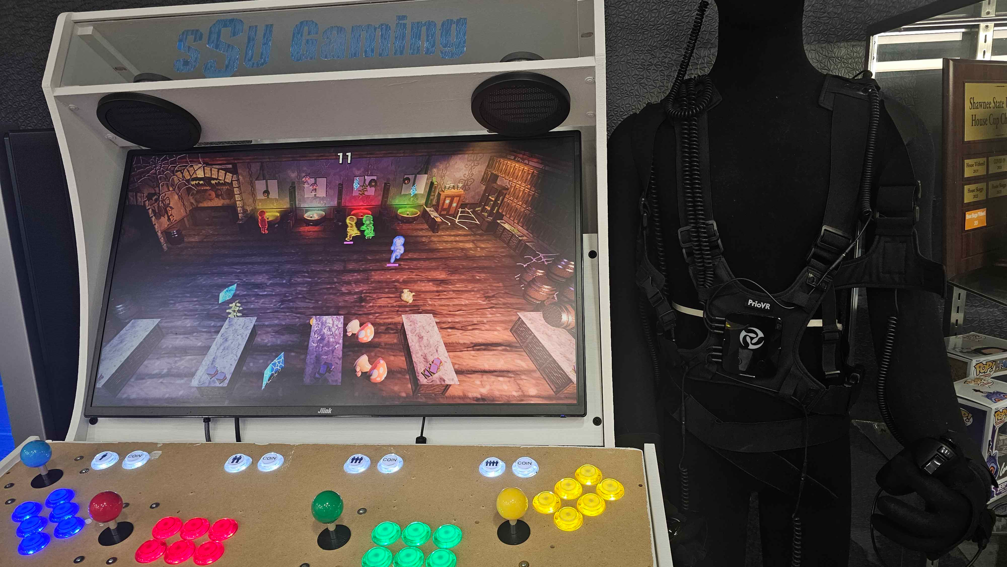 Layered throughout the space is a curated collection of awards and memorabilia, documenting the broader impact of the program. These artifacts include alumni game box art from shipped titles, a motion capture suit connected to early VR experimentation involving SSU Games graduates, a jersey designed by Marcus Cenci, and other items that reflect industry careers shaped through the program.