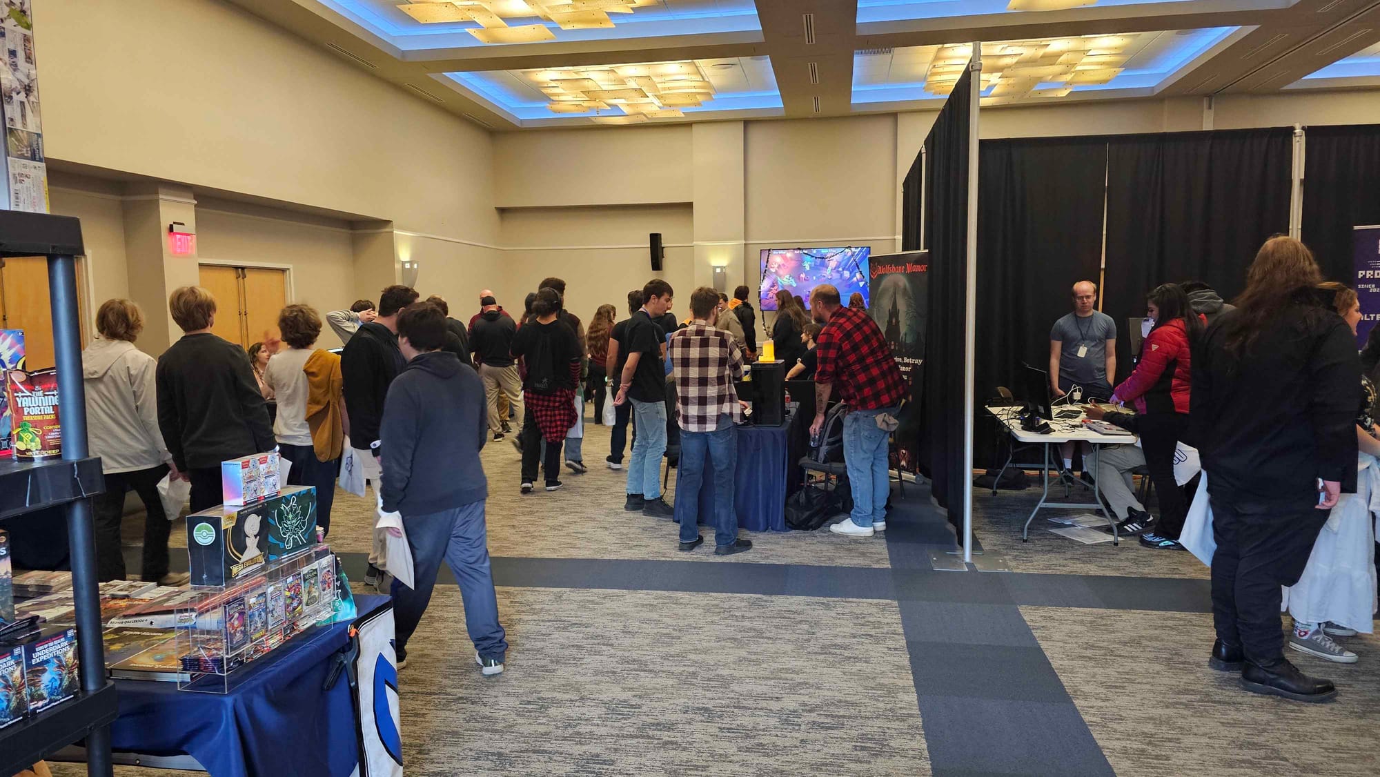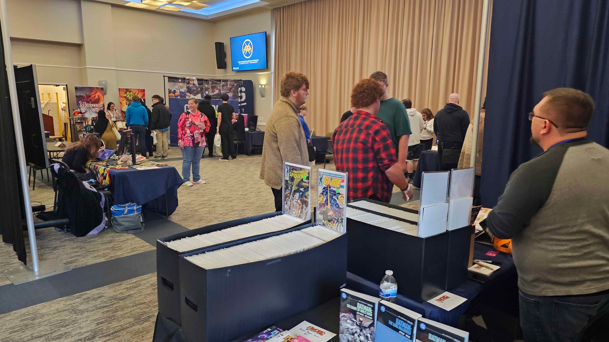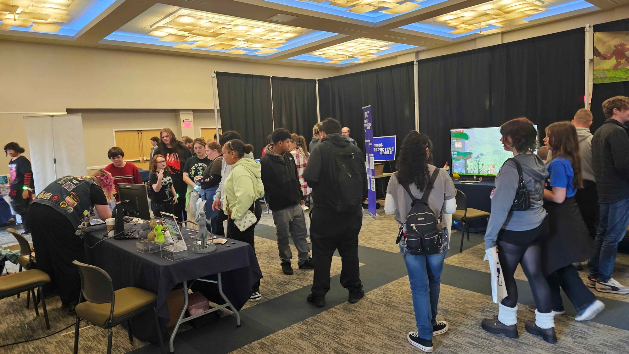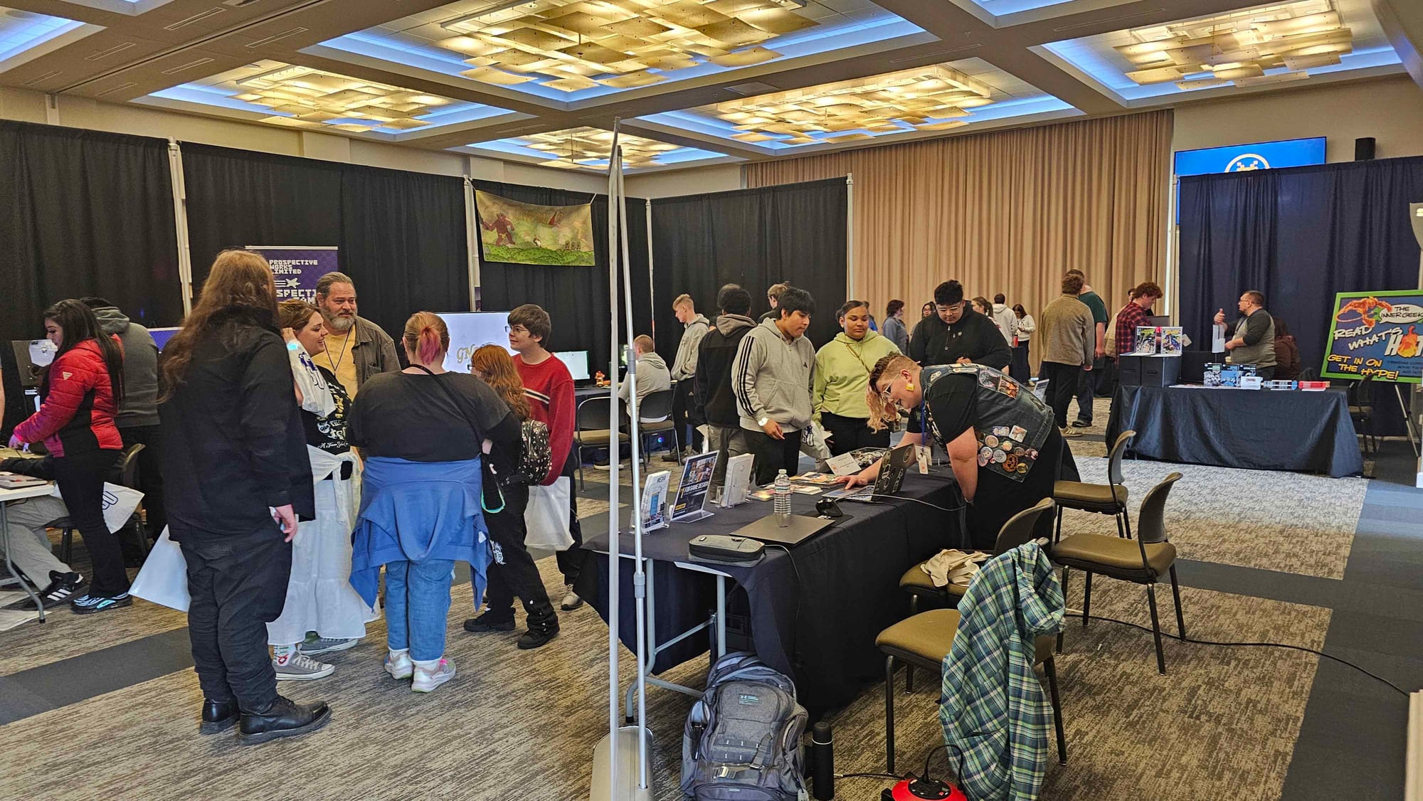 Passing the Side Quest booth, the path unfolded into the vibrant corridor of the Artist Alley. Attendees found themselves walking a gauntlet of inspiration, lined with stunning artwork and creative goods that sparked countless conversations between creators and their new fans. The journey of discovery then culminated as the space opened into the main ballroom, the epicenter of interactive fun. This vast space buzzed with energy, featuring student game demos, indie studios, innovative tech demonstrations, and vendor tables filled with comics, collectibles, and tabletop games.